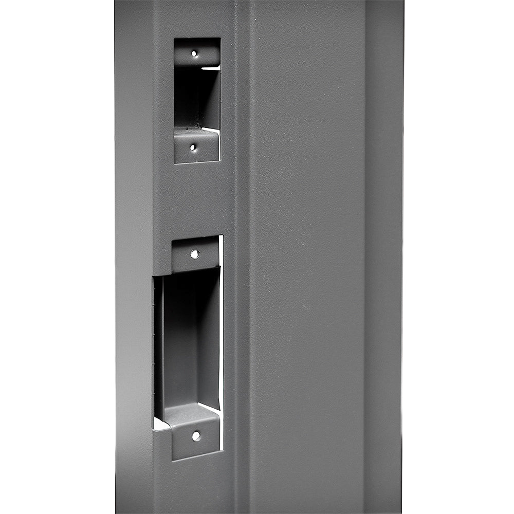 The frame is pre-machined for three 4½-inch hinges and an ASA strike, ensuring compatibility with standard commercial hardware and a secure fit. The mitered corners deliver a sharp, professional look, while top clamps and bottom strap anchors make installation fast and straightforward.